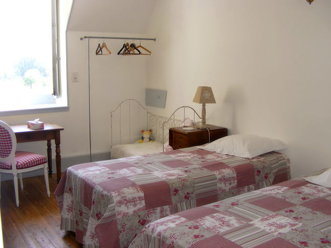 Elle comprend d'un coté 2 lits de 90 cm*190 cm, joignables en un grand lit de couple de 180 cm*190cm, et un lit d'enfant ancien en fer forgé.